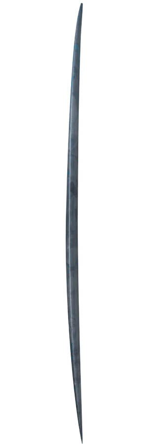 Flatter nose to performance tail rocker. The flat nose helps with paddle power and carry into waves, while on the nose it just tonks along better, maintaining momentum even if the wave slows down. The extra tail rocker was added for 2 reasons. 1st. A lot of features in the board stiffen and make it hard to turn, so the tail rocker offsets this and loosens it up again. 2. A good nose rider needs to slow down when you're on the nose, so you can hang in the curl of the wave, nose rocker, extra rocker in general or lastly extra tail rocker will slow a board down. So the goal is to slow the tail down so it drags water, rather than slowing the nose down so it pushes water.