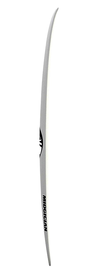 The Midgician features a flat entry rocker that seamlessly flows into a flattened exit. The flat bottom curve is combined with a forgiving, catch-resistant boxy rail and a single concave that flows into a deep double between the fins, eventually blending into a flat exit through the tail that provides an instant burst of speed from take-off and delivers maximum speed generation whilst maintaining manoeuvrability and drive.